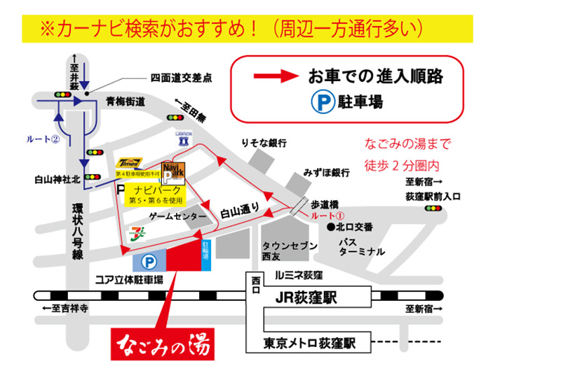 2つ目の角を右折、直進すると、突き当たりに「なごみの湯」。その隣にユア立体駐車場がございます。